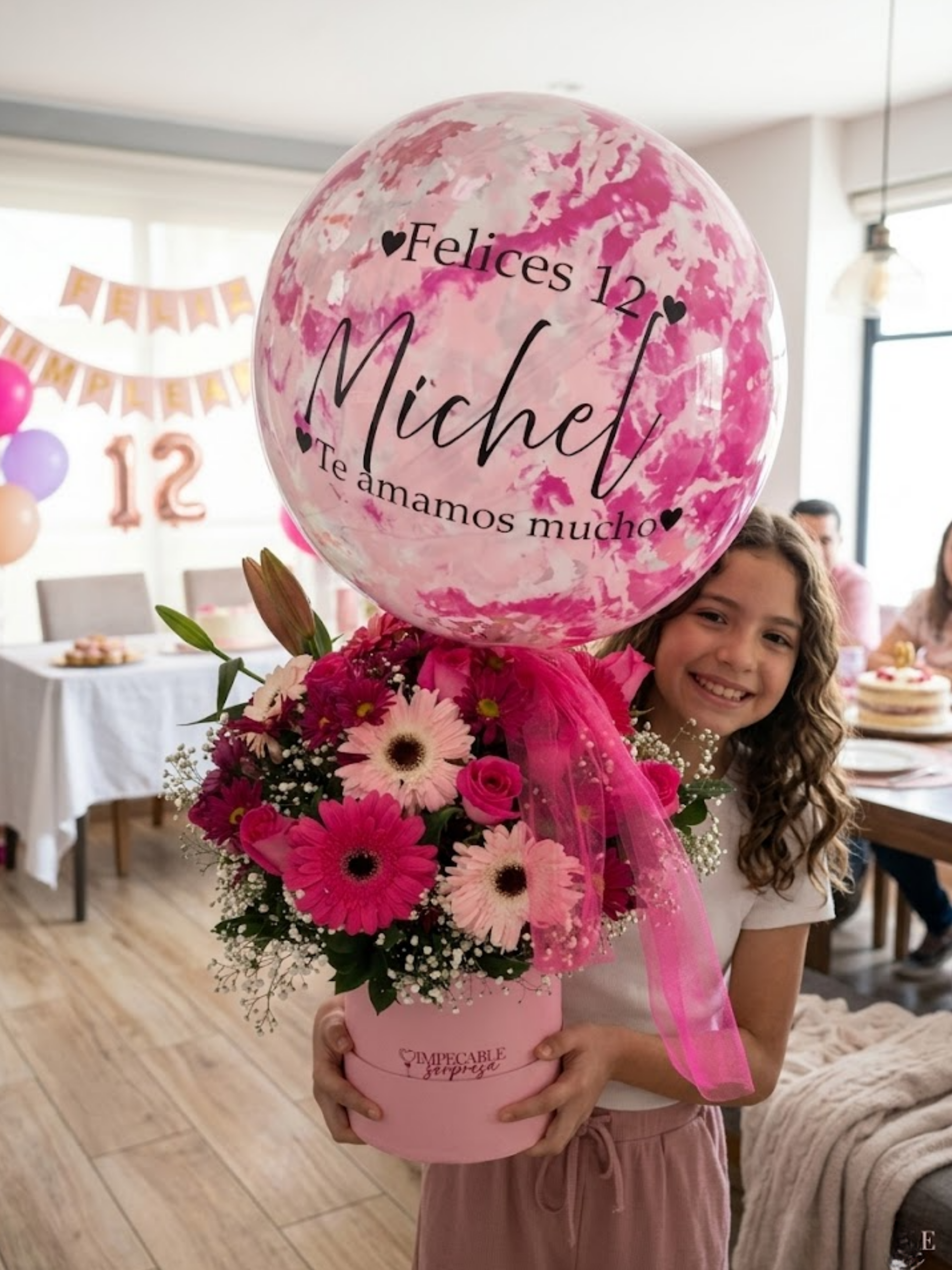 Cilindro Rosa Artesanal + 10 Gerberas + 16 Rosas Rosas Premium + Follaje + Globo burbuja 18" con diseño en pintura + Personalizado